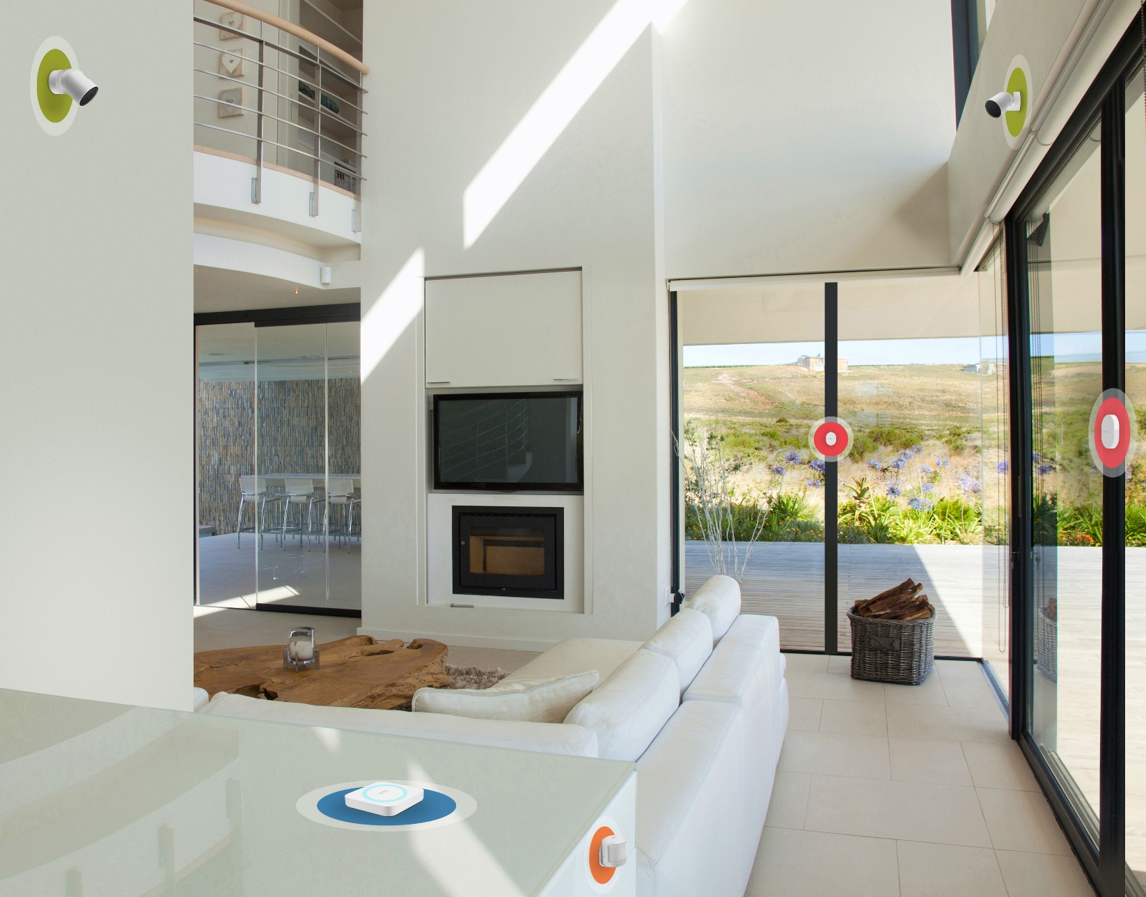 - Una videocamera, sensori per porte e finestre e un rilevatore di movimento tutti collegati fra loro