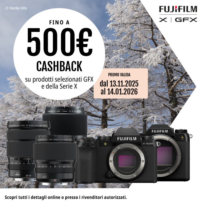 - Cashback, con rimborsi fino a 500 euro iva inclusa su una selezione di fotocamere e obiettivi delle Serie X e GFX.