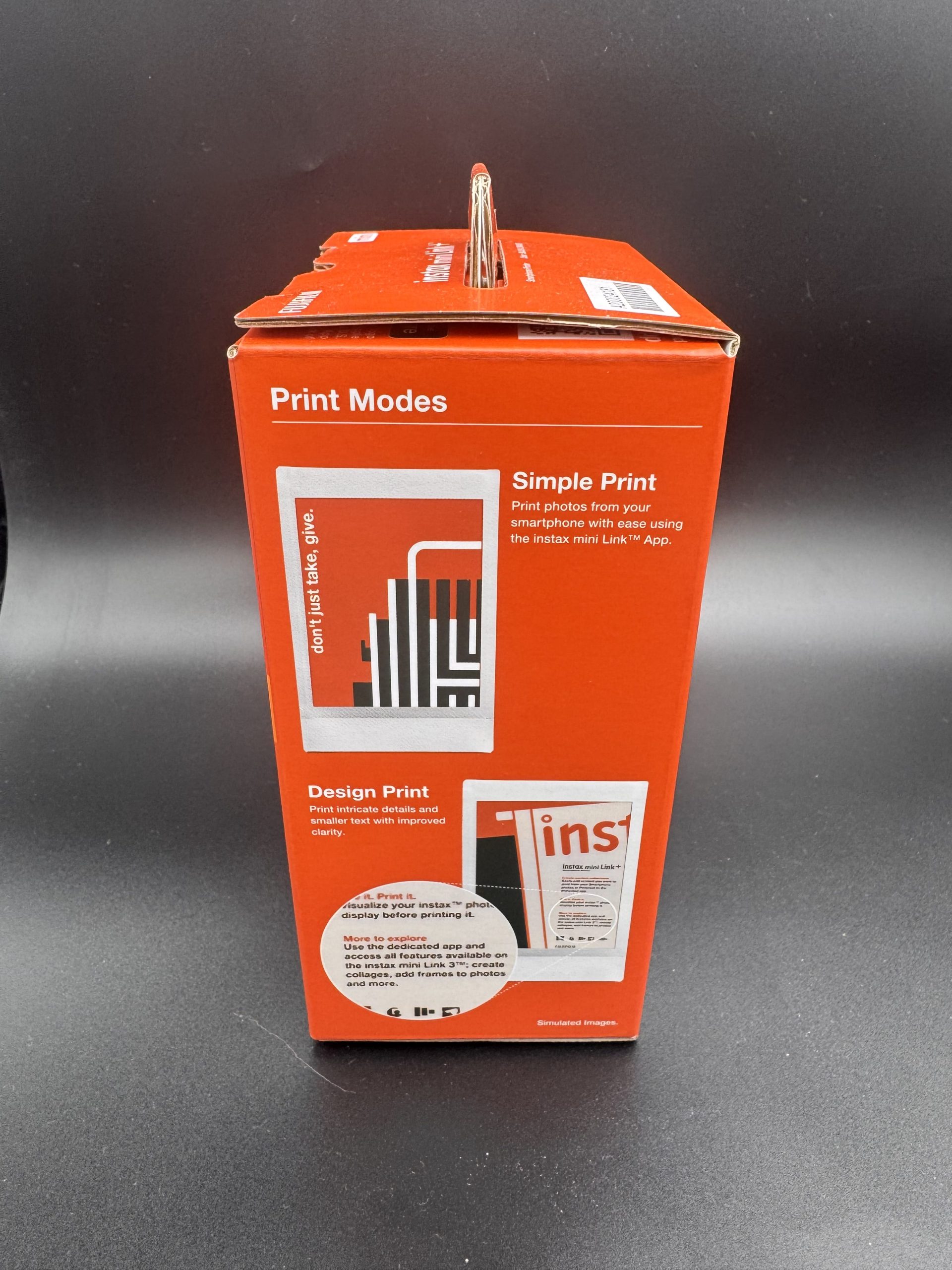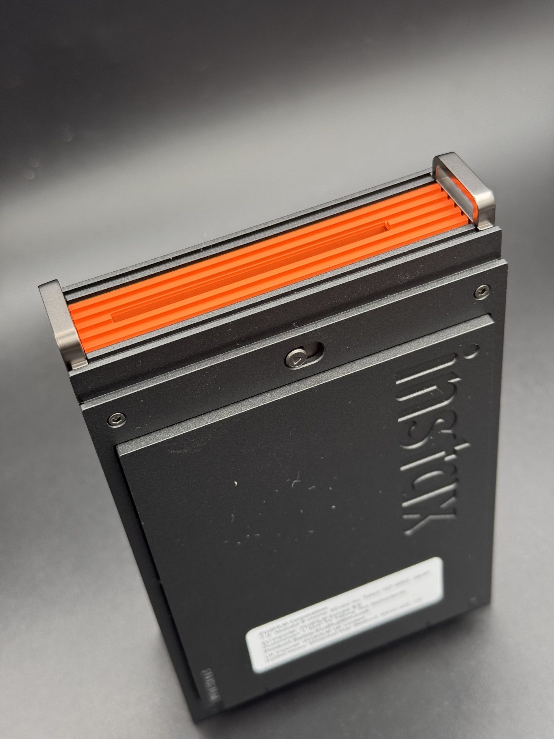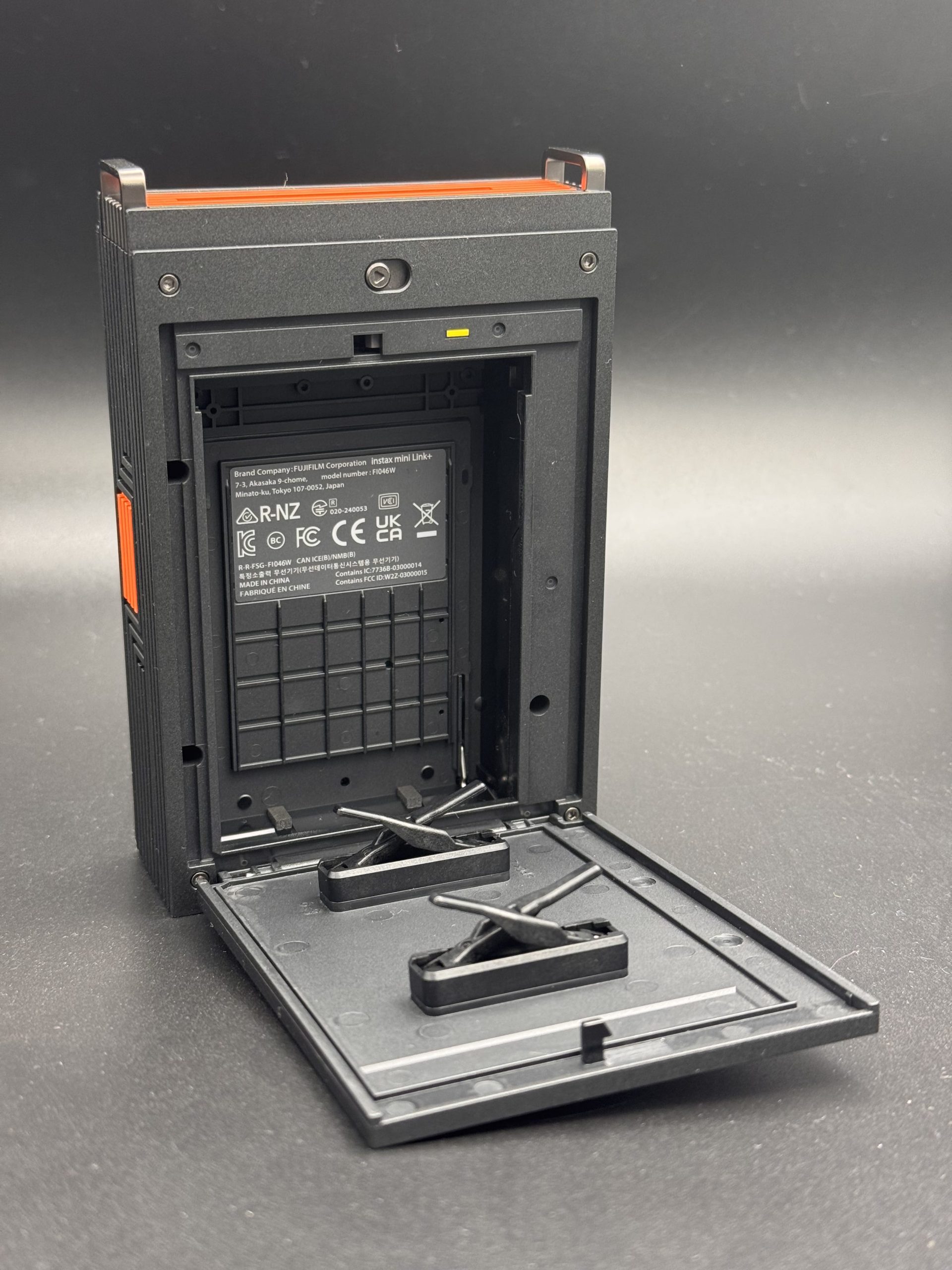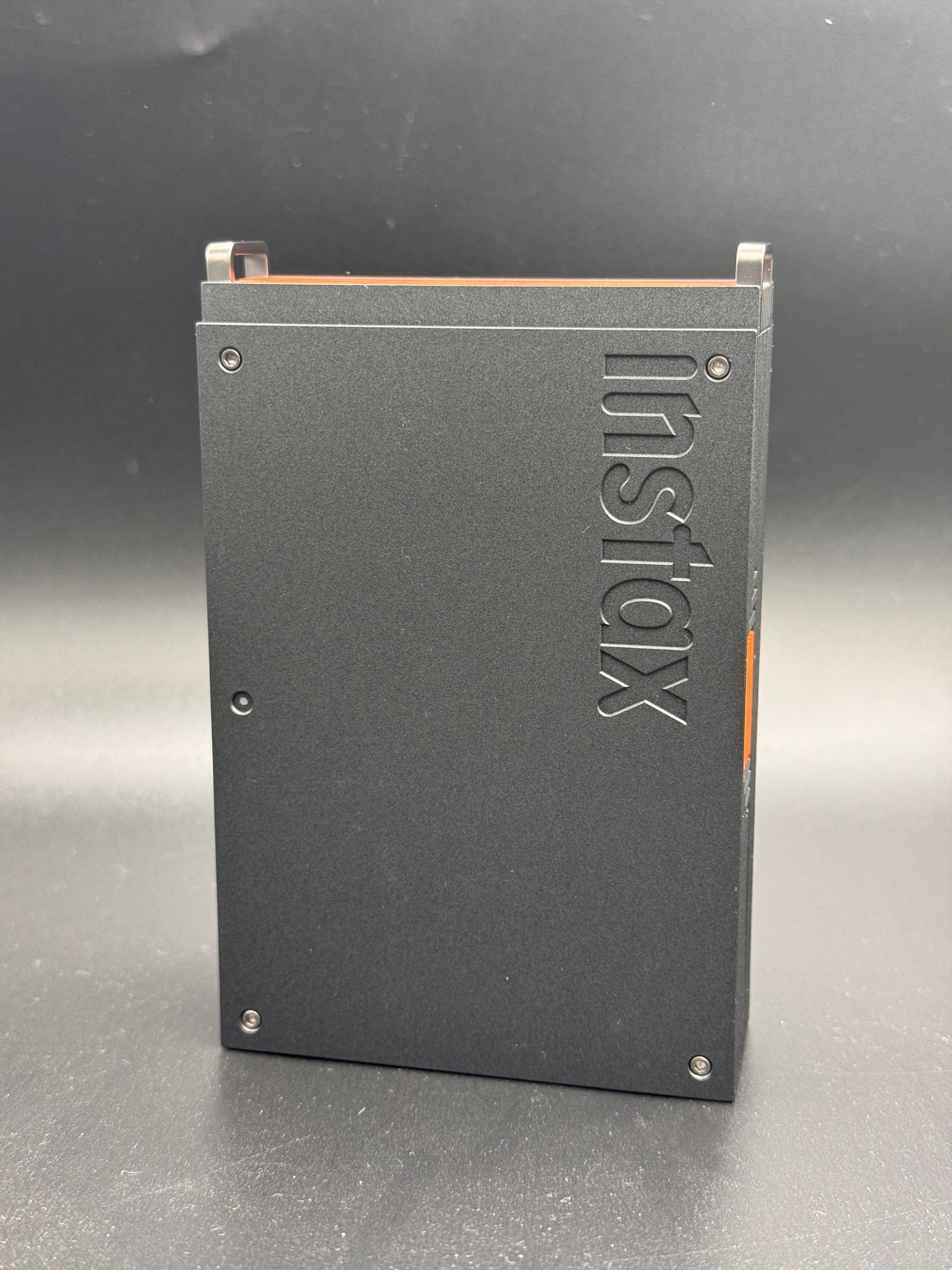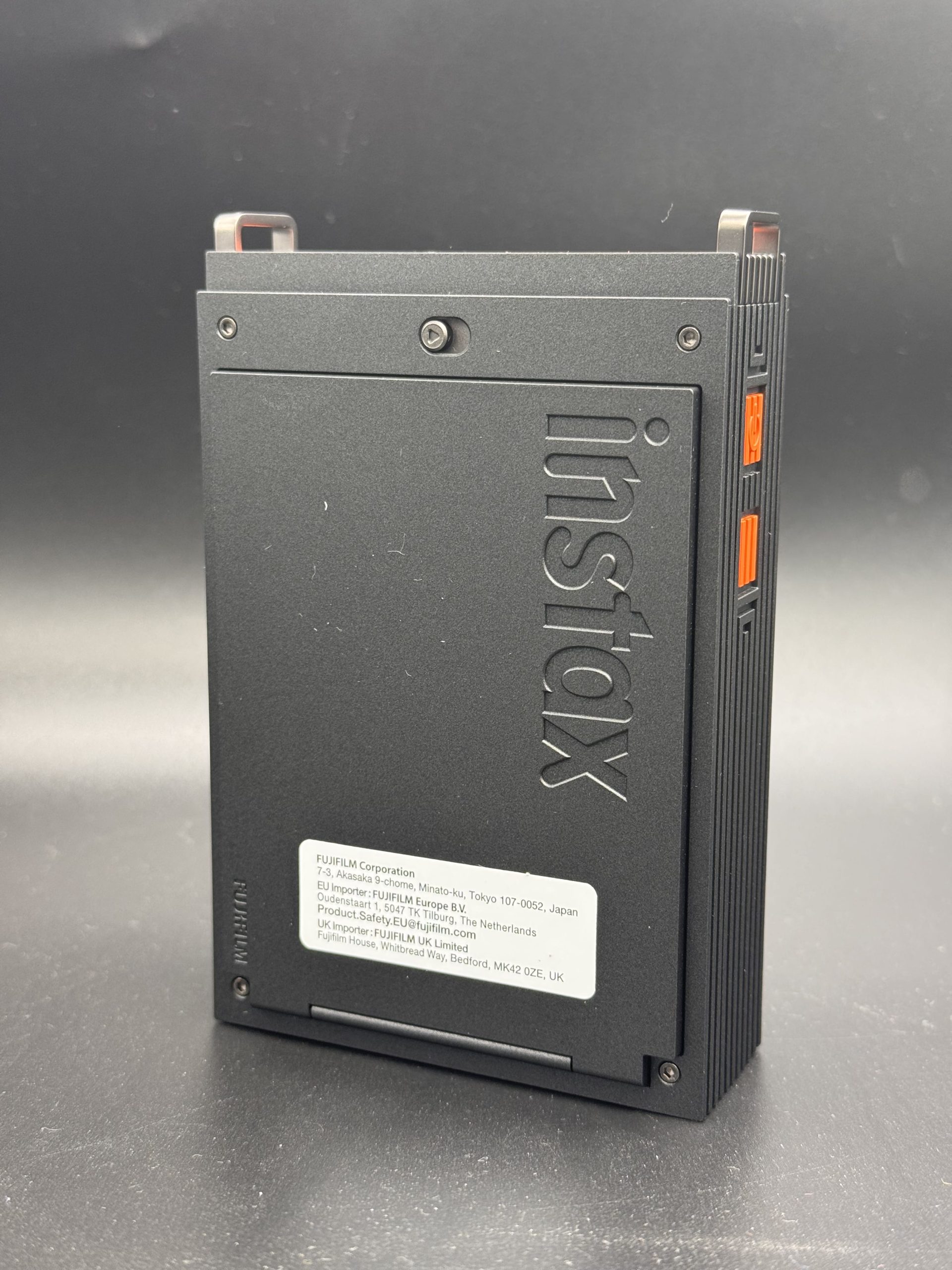 Il corpo è sottile e leggero (86,7 x 128 x 33,4 mm, 240 g senza pellicola), in plastica robusta nero opaco con accenti arancione vivace per un look moderno e grip sicuro. Lo slot per la pellicola è posta sul lato posteriore, con apertura tramite un pulsante a scorrimento. Sul lato frontale troviamo LED multicolore per status (power, batteria, pairing, stampa). Sul lato destro sotto un patto arancione, troviamo la porta USB-C nascosta per ricarica. Invece sul lato superiore troviamo il foro di uscita delle pellicole.