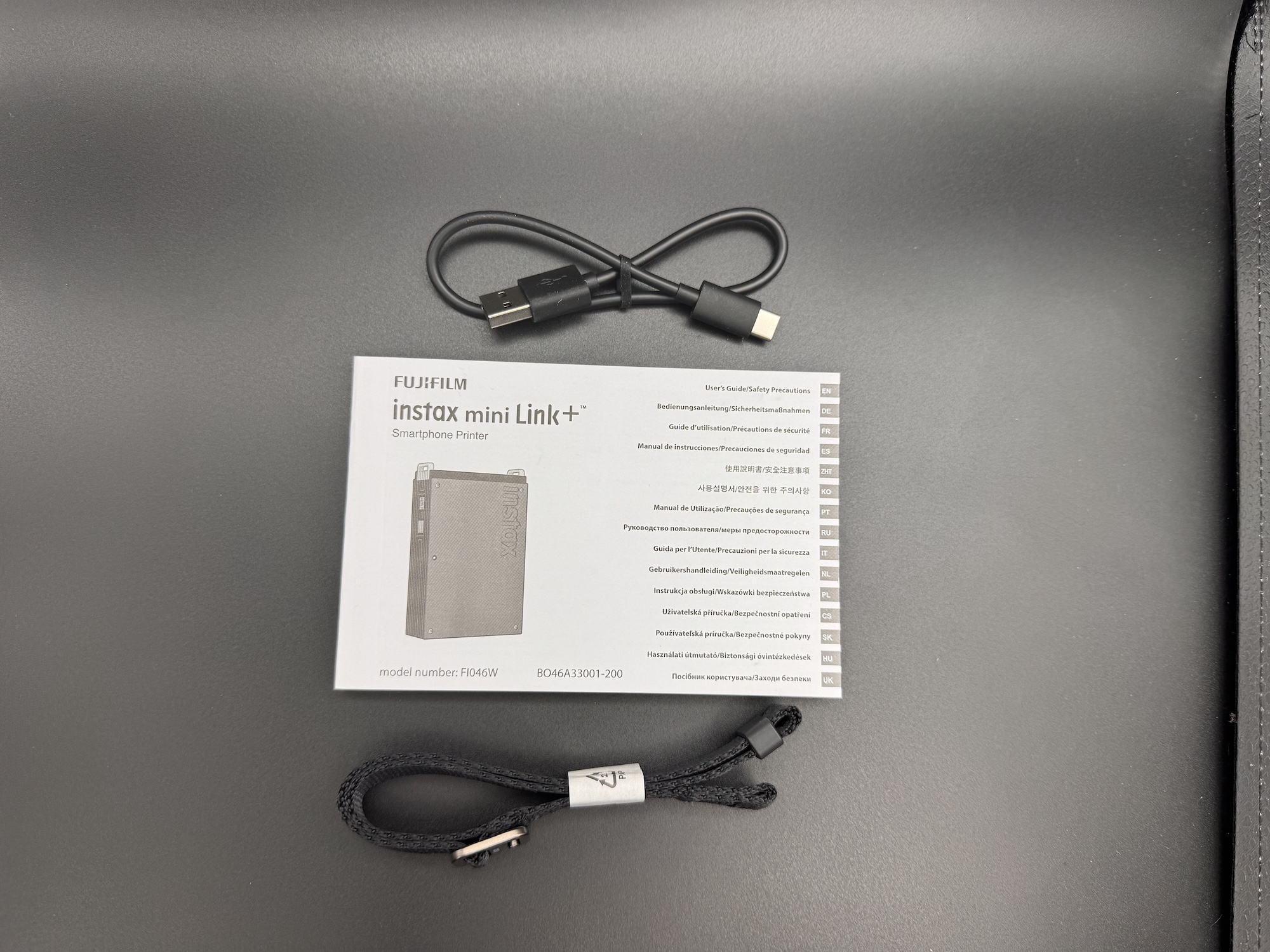 La Fujifilm Instax Mini Link+ arriva in una scatola minimalista e compatta, tipica dello stile Instax, con packaging eco-friendly e grafica accattivante che richiama il design rétro. All’interno troviamo la stampante, un cavo USB-C corto (30 cm) per ricarica, una fascetta regolabile per portarla al collo o al polso, e il manuale utente multilingua (incluso italiano).